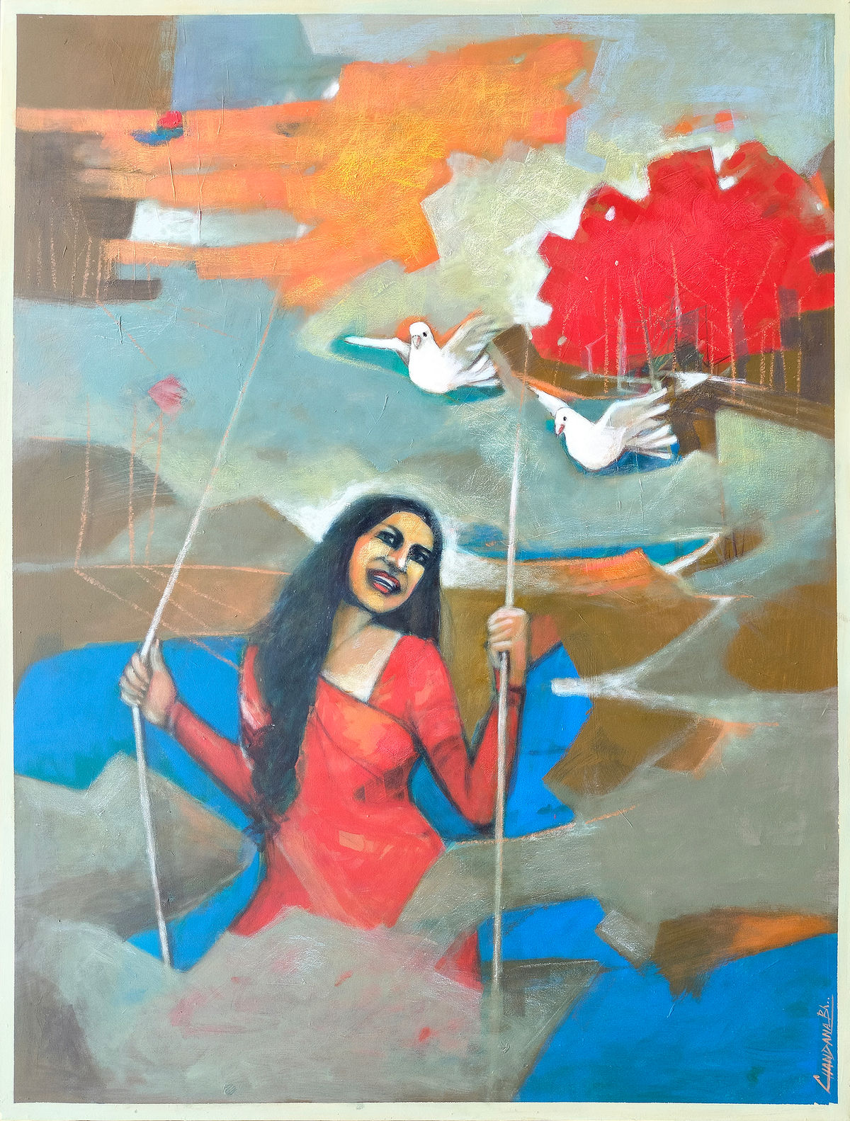 Original contemporary painting: Unfolding Emotions-2 by Chandana Bhattacharjee. This evocative piece portrays a woman on a swing, surrounded by a sense of serenity and emotion. The delicate figure of the woman captures a moment of introspection as if she is gently swaying between thoughts and emotions. A bird, soaring nearby, adds a symbolic touch, representing freedom and the fluid nature of inner feelings. Bhattacharjee’s use of soft colours and graceful lines invites viewers to reflect on the complexity of emotions and the peaceful flow of thought, captured beautifully in this intimate moment.